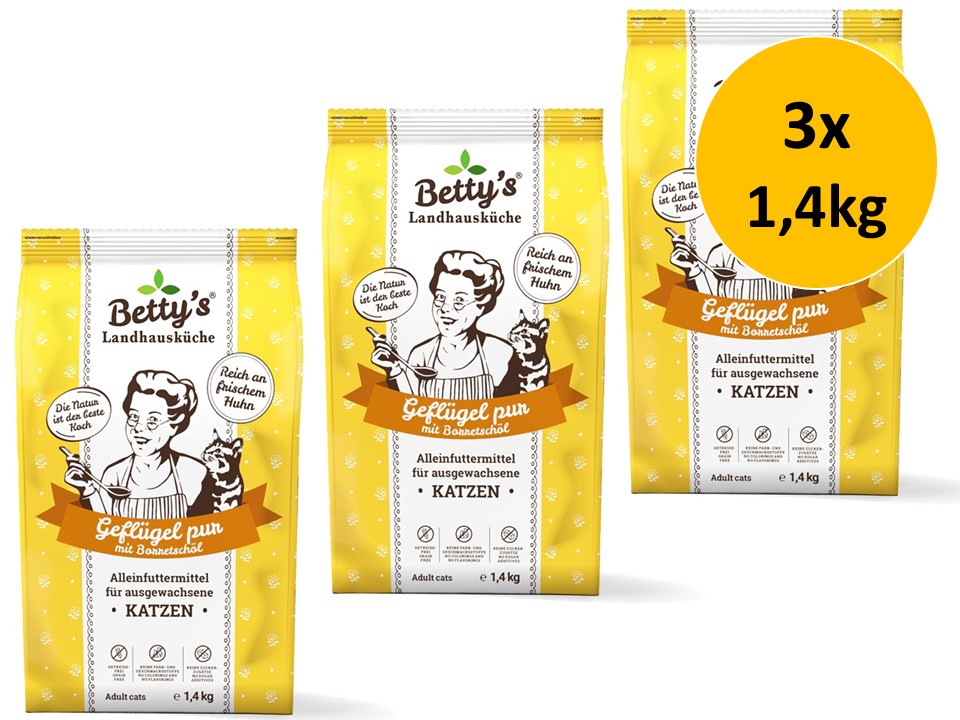 Bettys Landhausküche Adult Geflügel pur im 3 × 1,4 kg Sparpack bietet eine ausgewogene, gut verträgliche Katzenernährung mit hochwertigem Geflügelprotein. Ideal für Katzenhalter, die Wert auf Qualität, Geschmack und praktische Vorratspackungen legen.