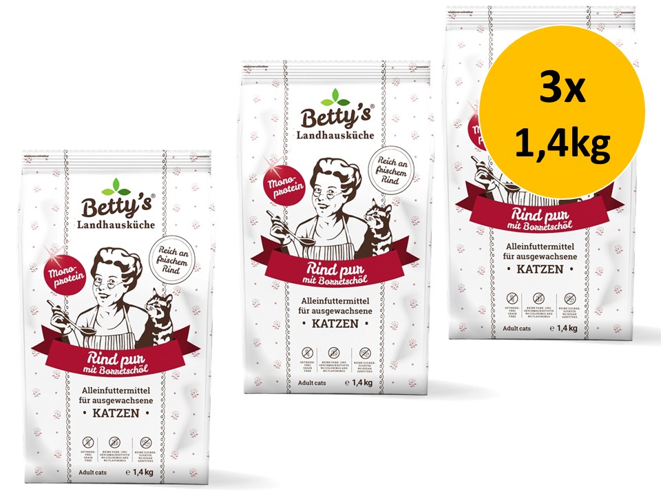 Bettys Landhausküche Adult Rind pur im 3 × 1,4 kg Sparpack bietet eine ausgewogene, schmackhafte Katzenernährung mit hochwertigem Rindprotein. Ideal für Katzenhalter, die Wert auf Qualität, gute Verträglichkeit und praktische Vorratspackungen legen.