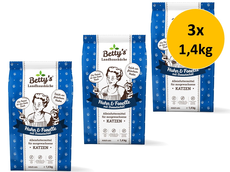 Bettys Landhausküche Adult Huhn & Forelle – 3 × 1,4 kg Katzentrockenfutter Sparpack