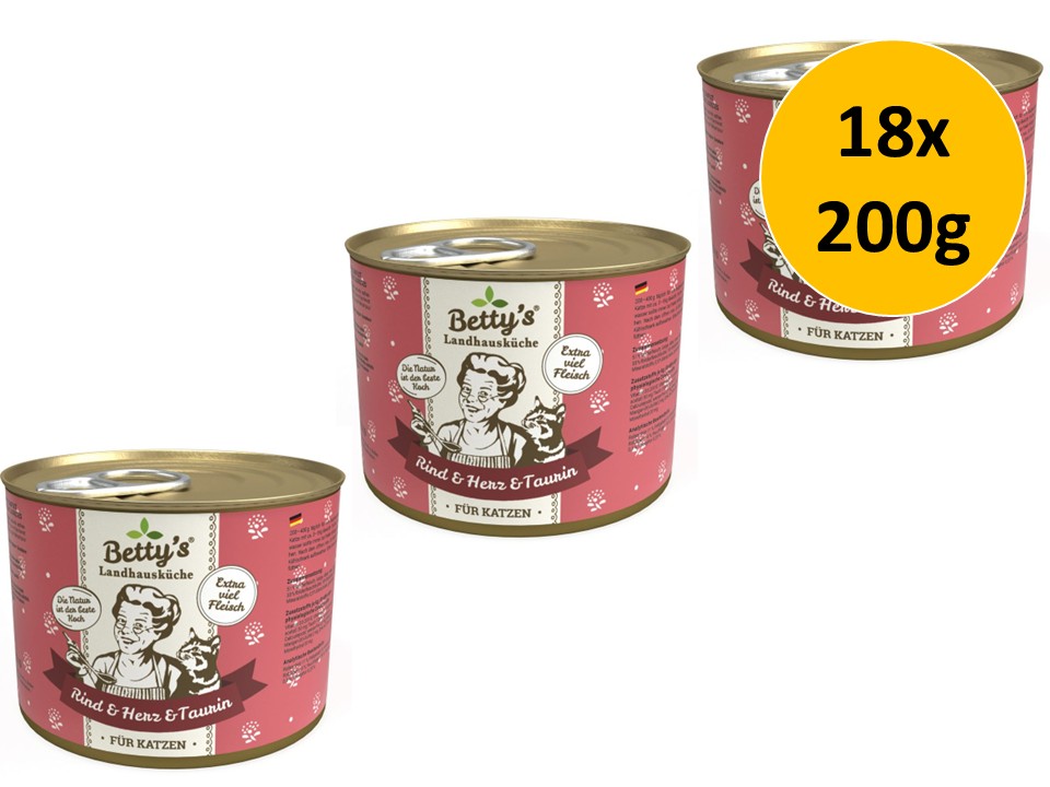 Bettys Landhausküche Katze Rind & Herz bietet eine natürliche, hochwertige und besonders schmackhafte Ernährung. Das praktische 18x 200g Sparpack ist die ideale Lösung für alle, die Wert auf Qualität und Wirtschaftlichkeit legen.