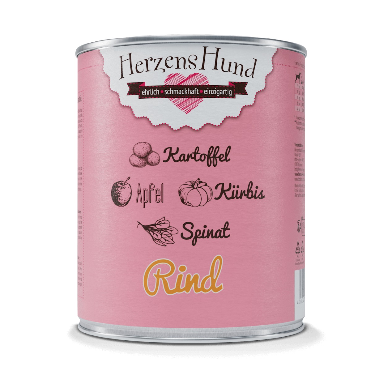 Herzenshund Rind mit Kartoffel, Kürbis, Apfel, Spinat und Leinöl 6 × 800 g ist ein hochwertiges Nassfutter für Hunde mit kräftigem Rindfleisch und ausgewählten pflanzlichen Zutaten. Die ausgewogene Rezeptur kombiniert tierische Proteine mit Gemüse, Obst und wertvollen Fettsäuren für eine natürliche, tägliche Ernährung.